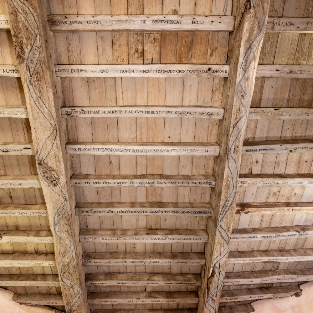 Going further than the murals, he had the roof beams painted with quotations, mostly classical. As a daily reminder of his commitment to literature perhaps or perhaps because it was the interior design fashion that time.